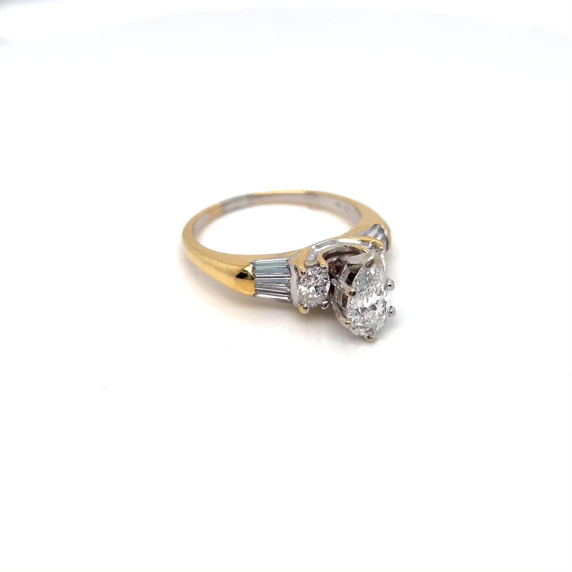 One central diamond in 6 prong setting with 2 oval Diamonds on each side 4 prong setting, with 3 Baguettes on each side on the ring shank in invisible setting;