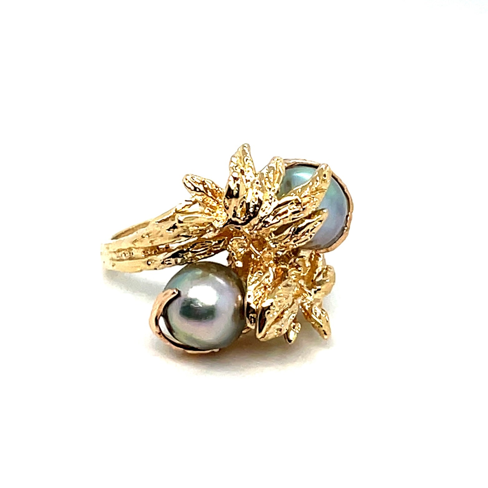 Two Pearls set in ring, between them beautiful leaf’s encrusted with Diamond cut design, Fresh Water natural Pearls, Grey Silver Bluish Color, high luster;